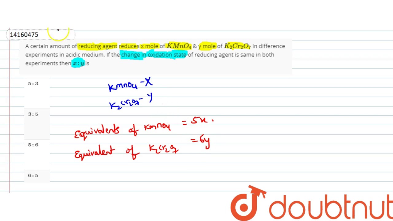 A certain amount of reducing agent reduces x mole of `KMnO_(4)` & y mole of `K_(2)Cr_(2)O_(7)` in difference experiments in acidic medium. If the change in oxidation state of reducing agent is same in both experiments then `x:y` is